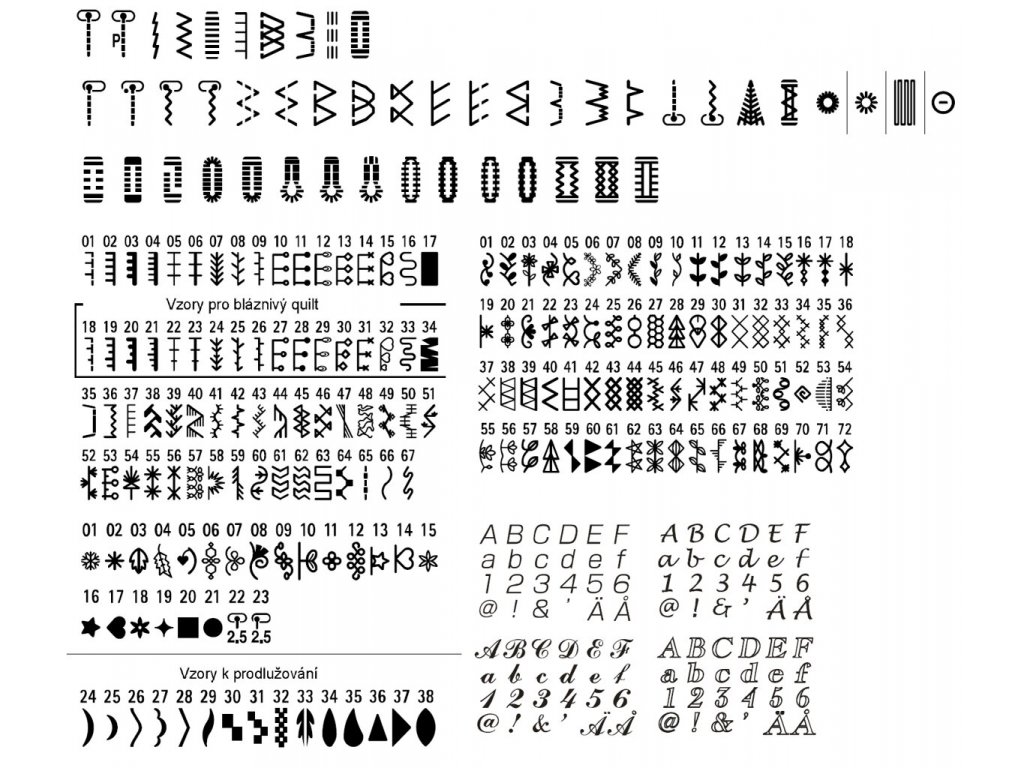 - pro šití: základní patka, patka pro šití senzorové knoflíkové dírky, patka pro šití manuální knoflíkové dírky, patka pro overlockový steh, kráčející patka, 2x patka pro patchwork, patka pro volné quiltování, patka pro slepý steh, zipová patka, teflonová patka, patka pro všívání aplikací,